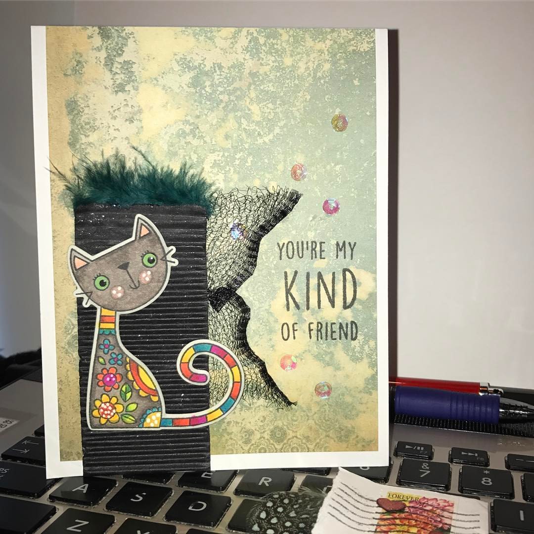 I colored the image with Spectrum Noir markers then decided it needed a background and colored the whole background with my BT2 marker. (It's one of my three favorite colors!) To make the little piece the sentiment is on, I punched the circle then cut up two paper flowers and glued the pieces to the back. Finally, I colored the petals with BT3 to get the color closer to the background color of the main image.
